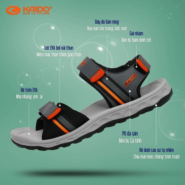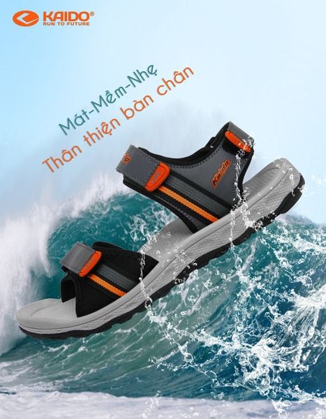 - Dép xăng đan nam thương hiệu Kaido, mã KD-2138, thuộc dòng xăng đan được thiết kế theo phong cách đơn giản, nhẹ nhàng nhưng rất tinh tế, sang chảnh và bắt mắt. Mũ dép đơn giản chì là sự kết hợp vật liệu PU + dây dù bản rộng đem tới cảm giác rất ôm chân và thoải mái khi di chuyển. Đế dưới là lớp cao su chịu mài mòn và chống trơn trượt. Đế trên là lớp EVA xốp nhẹ và dày dặn, tạo cảm giác hết sức êm ái và thoải mái khi sử dụng.